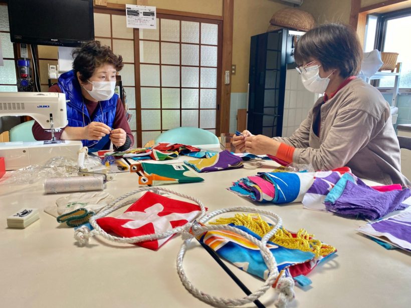 We offered to buy the Tairyō-bata flags from families who were not fishing any longer. We then asked local ladies to sew simple bags that can be used as cleaning kits for beaches.