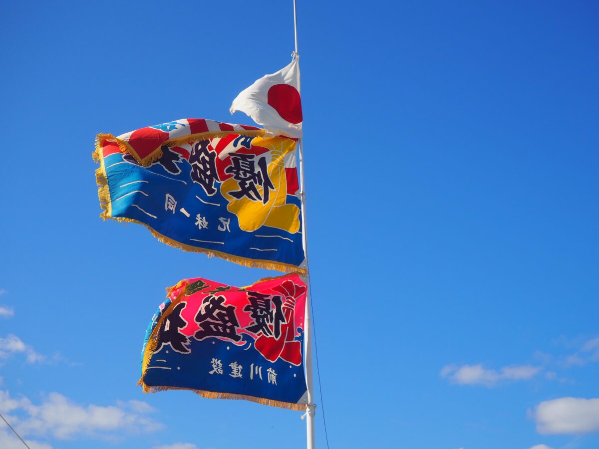 So what are these flags? Traditionally, fishermen put them up to celebrate a big catch, and the name Tairyō-bata is literally translated as “big catch flag”. On New Year’s Eve, they symbolize the hope for the big catch in the upcoming year.