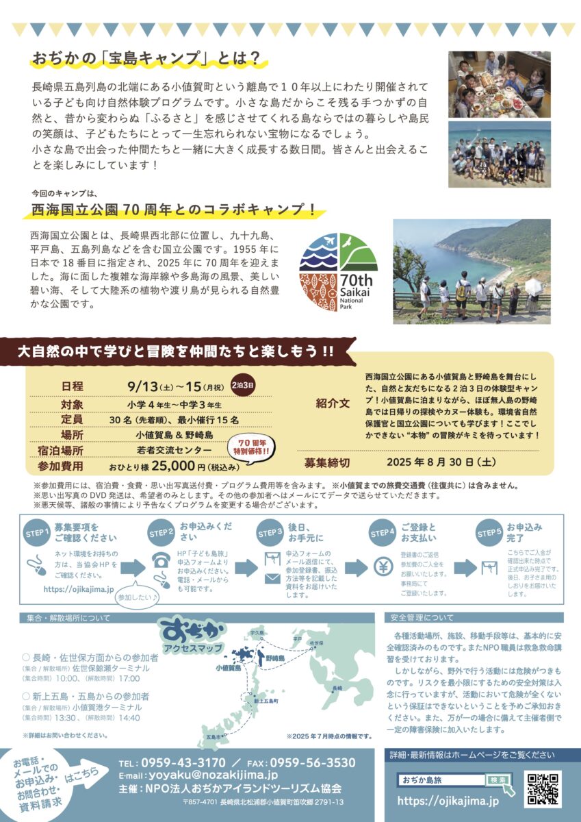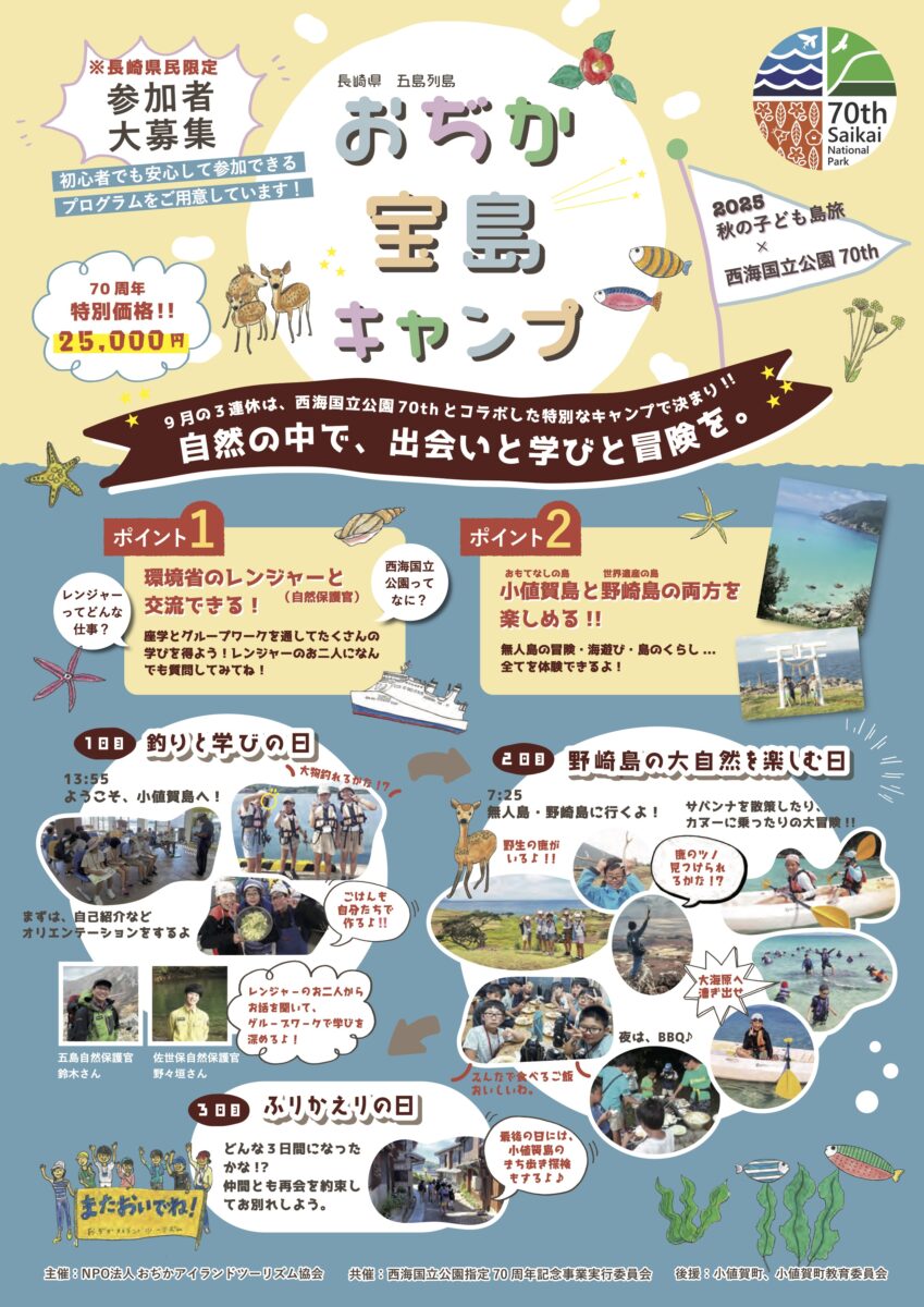 この度、小値賀町も指定されている、西海国立公園が70周年となったことを記念して、秋の宝島キャンプを実施することになりました!